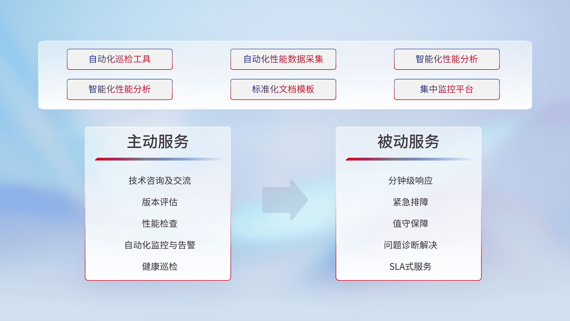 智能化工具和标准化文档,,,,保障服务质量,,,,提供主动服务(包含技术咨询、、、、版本评估、、、性能检查、、、自动化监控与告警、、健康巡检)和被动服务包含(分钟级响应、、紧急排障、、、值守保障、、、问题诊断解决、、、SLA服务)。。。
